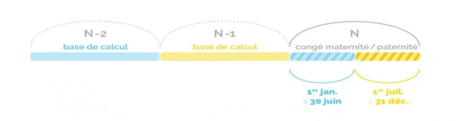 Deux cas encore une fois : votre congé maternité commence dans la première moitié de l'année, entre le 1er janvier et le 30 juin, votre année de référence sera N-2, votre congé débute dans la deuxième moitié de l'année du 1 juillet au 31 décembre, votre année de référence sera N-1. Je vous met le petit schéma présent sur leur site.